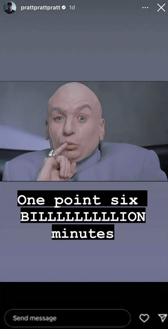 Offering their thoughts via their respective Instagram stories, Pratt first shared a screenshot of the headline by itself, followed by an image of Dr. Evil from the Austin Powers franchise captioned with the slight tweak on the character’s signature ransom declaration, “One Point Six BILLLLLLLLION minutes”.
