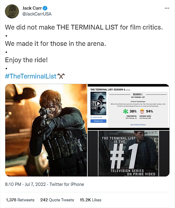 “We didn’t make The Terminal List for Critics,” wrote Carr. “We made it for those in the arena.”