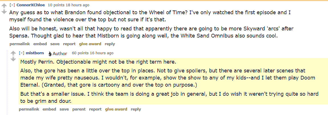What do you make of Brandon Sanderson calling what Rafe Judkins and Prime Video did to Perrin “objectionable?”