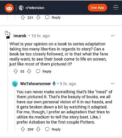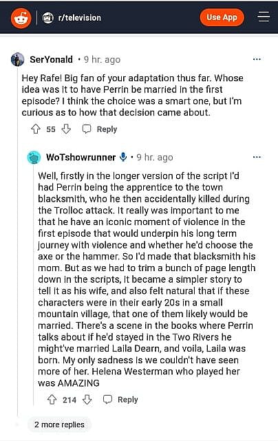 Judkins would also provide a lengthier explanation as to why he made Perrin a married man in the show as well as having Perrin killing his wife in the heat of a battle with Trollocs.