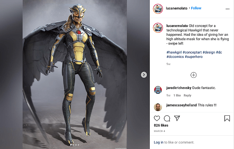 “Old concept for a technological Hawkgirl that never happened,” Nemolato wrote in an Instagram post, though he did not specify how old the rendering is.