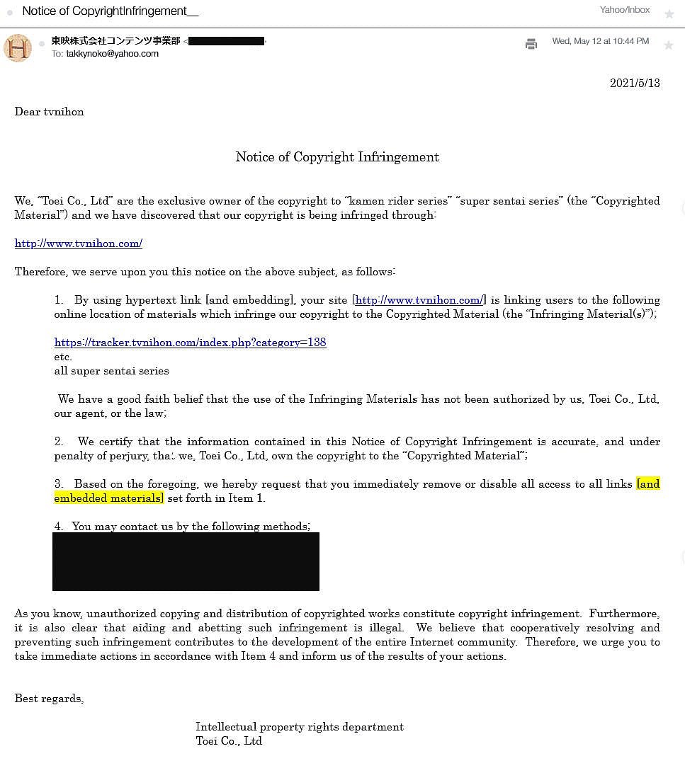 According to the letter shared by Takenoko, Toei took issue with how TV-Nihon linked users to torrents containing “materials which infringe our copyright” (i.e. subtitled releases of Super Sentai and Kamen Rider) and requested “that you immediately remove or disable all access to all links” to the subtitled releases.