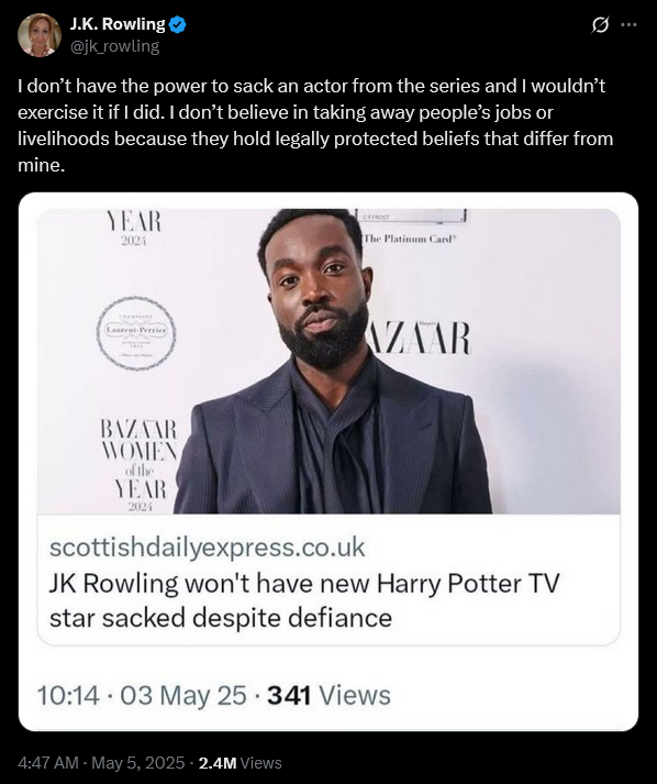 Taking to her personal Twitter account on May 5th, Rowling shared a screenshot of an article from the Scottish Daily Express regarding the claim made by an alleged insider to fellow UK news outlet The Daily Mail that the author “won’t care at all” about their disagreement and declared, “I don’t have the power to sack an actor from the series and I wouldn’t exercise it if I did.”