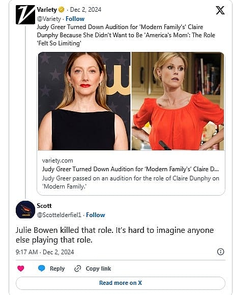 Most fans praised Greer as a great actress but saw her as a mismatch for the role of Claire. “While I like Judy Greer, Julie Bowen owned the hell out of that role, and I wouldn’t want it another way,” one Reddit user wrote in the thread. “Judy Greer is great in everything I’ve seen her in, but I can’t imagine anyone else besides Julie Bowen; the casting was perfect,” another one said.
