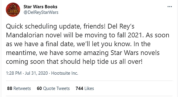 They wrote in July 2020, “Quick scheduling update, friends! Del Rey’s Mandalorian novel will be moving to fall 2021. As soon as we have a final date, we’ll let you know. In the meantime, we have some amazing Star Wars novels coming soon that should help tide us over.”