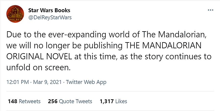 They wrote on Twitter, “Due to the ever-expanding world of The Mandalorian, we will no longer be publishing THE MANDALORIAN ORIGINAL NOVEL at this time, as the story continues to unfold on screen.”