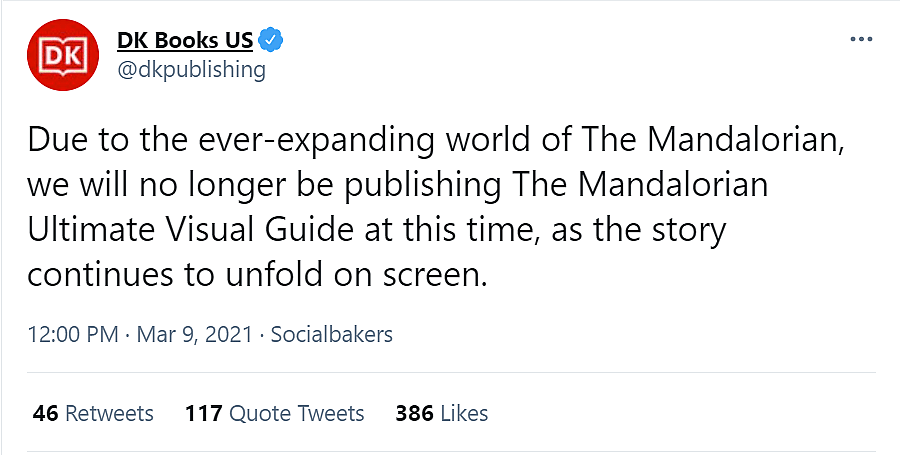 They wrote on Twitter, “Due to the ever-expanding world of The Mandalorian, we will no longer be publishing The Mandalorian Ultimate Visual Guide at this time, as the story continues to unfold on screen.”