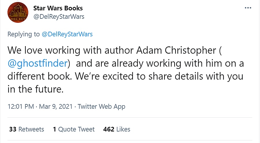 In a follow-up they added, “We love working with author Adam Christopher (@ghostfinder) and are already working with him on a different book. We’re excited to share details with you in the future.”