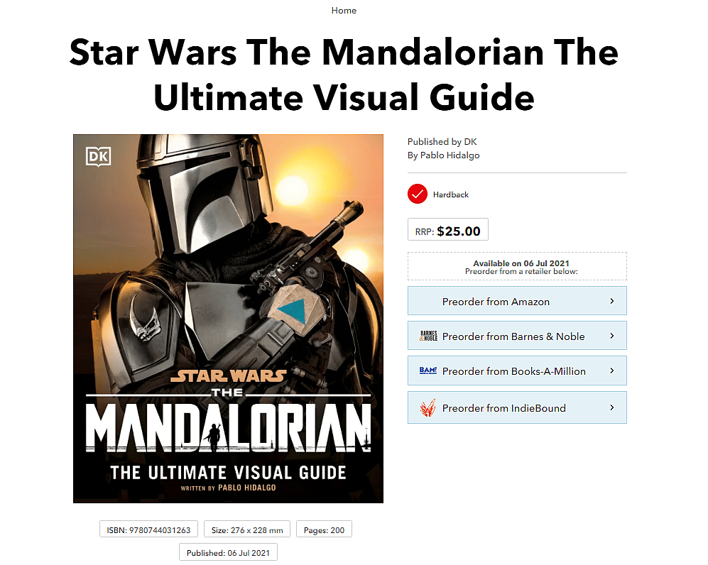 A description reads, “Star Wars: The Mandalorian: The Ultimate Visual Guide is the 200-page definitive companion to Seasons 1 and 2 of The Mandalorian, exploring the heroes, villains, creatures, aliens, droids, locations, and technology from the show. Packed with 500+ images, plus a new cross-section, and written by Star Wars scribe Pablo Hidalgo, it’s a must-have for all fans who want to learn more.”