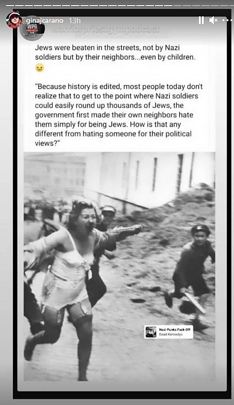 The post in question was a screenshot of a post made by warriorpriestgympodcast. Carano shared it to her Instagram stories.