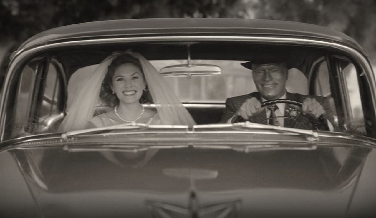 The first episode titled “Filmed Before A Live Studio Audience” begins with Vision and Wanda arriving in what appears to be a sleepy suburb in what looks like the late 1950 to early 1960s just after getting married.