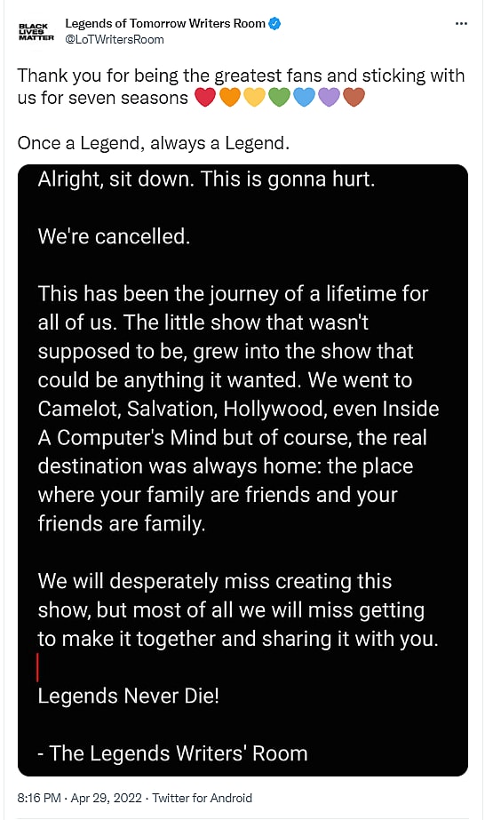 They wrote on Twitter, “Thank you for being the greatest fans and sticking with us for seven seasons. Once a Legend, always a Legend.”