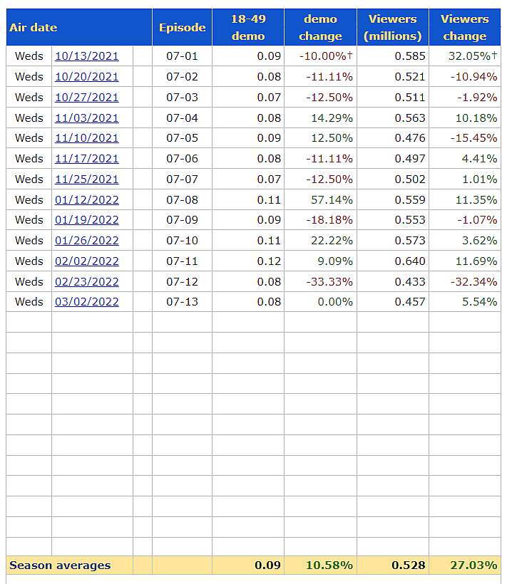 According to TV Series Finale, the show, in its seventh season, had similar ratings to Batwoman’s third season with an average of .09 in the 18-49 demographic with average viewership at 528,000,
