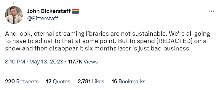 He did admit, “And look, eternal streaming libraries are not sustainable. We’re all going to have to adjust to that at some point. But to spend [REDACTED] on a show and then disappear it six months later is just bad business.”