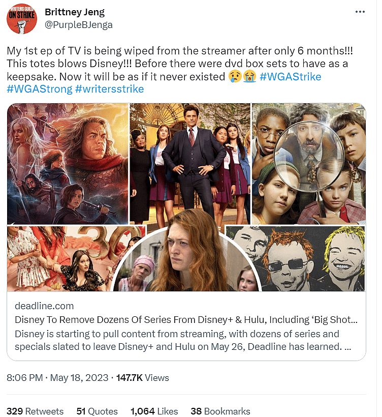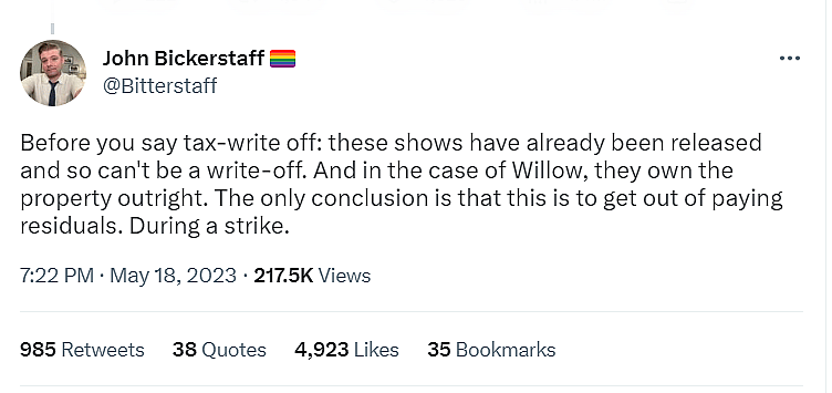 He added, “Before you say tax-write off: these shows have already been released and so can’t be a write-off. And in the case of Willow, they own the property outright. The only conclusion is that this is to get out of paying residuals. During a strike.”
