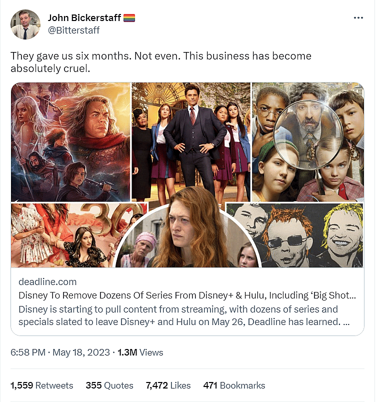 In response to this report that Willow will be pulled from Disney+, Bickerstaff took to Twitter where he wrote, “They gave us six months. Not even. This business has become absolutely cruel.”