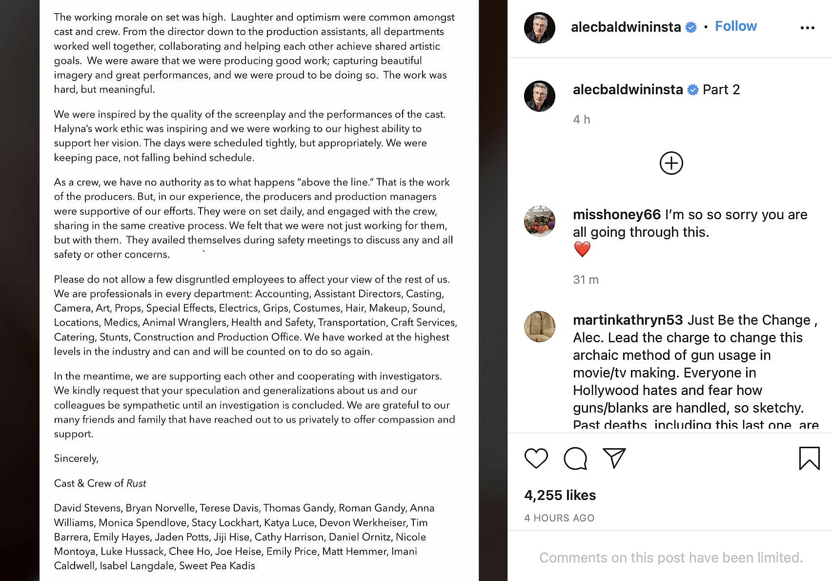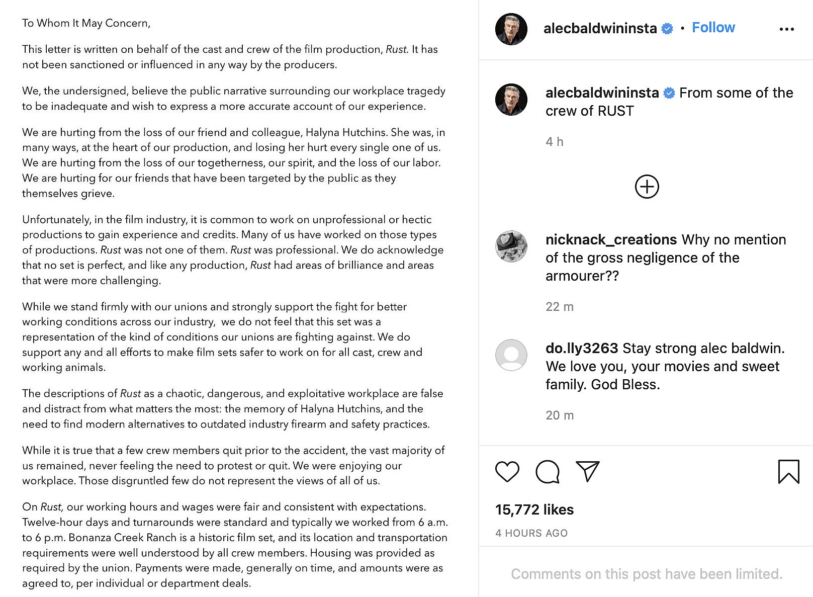 It is relevant to point out that the recently released statement, although allegedly issued by members of the film’s cast and crew, was actually shared on Alec Baldwin’s personal Instagram account.