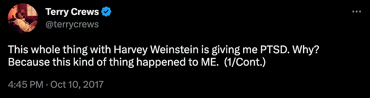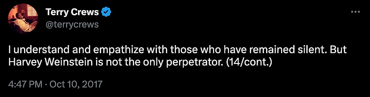 Crews would then go on to list some of the reasons he, and presumably others who have also gone through a similar experience, prefer to remain silent, saying, “Who’s going 2 believe you? ( few) What r the repercussions?(many) Do u want 2 work again? (Yes) R you prepared 2b ostracized?(No).”