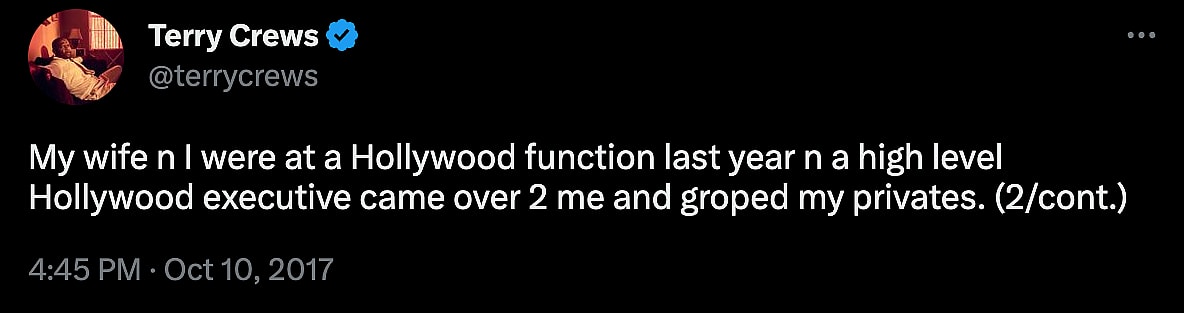 In a follow-up tweet, the White Chicks actor declared, “My wife n I were at a Hollywood function last year n a high level Hollywood executive came over 2 me and groped my privates.”