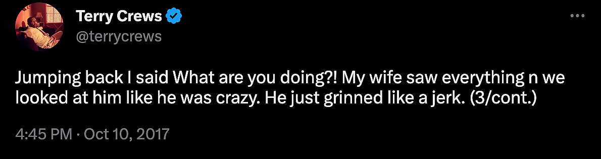 “Jumping back I said What are you doing?! My wife saw everything n we looked at him like he was crazy. He just grinned like a jerk,” Crews claimed.