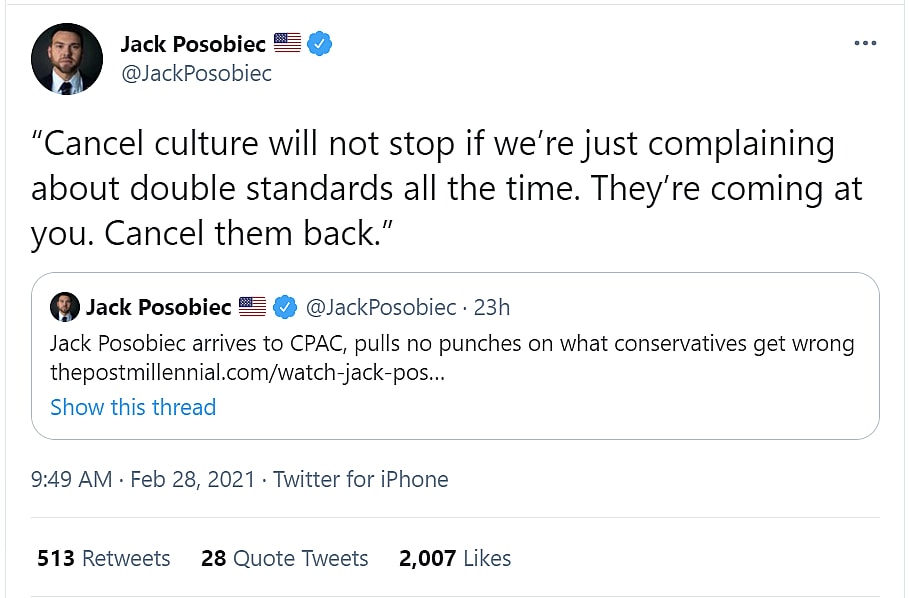 Posobiec would later double down quoting himself on Twitter, “Cancel culture will not stop if we’re just complaining about double standards all the time. They’re coming at you. Cancel them back.”