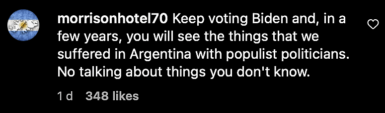 “Keep voting Biden and, in a few years, you will see the things that we suffered in Argentina with populist politicians,” warned morrisonhotel70. “No talking about things you don’t know.”