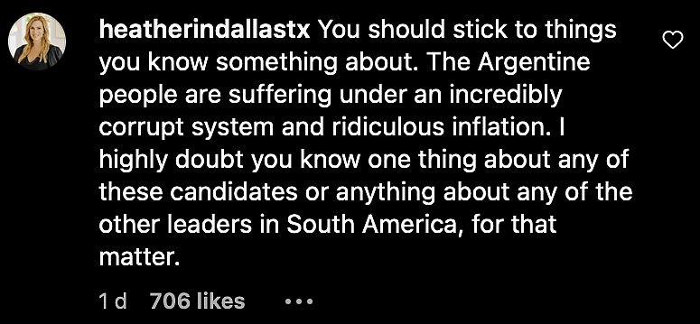 “You should stick to things you know something about,” suggested heatherindallastx. “The Argentine people are suffering under an incredibly corrypt system and ridiculous inflation. I highly doubt you know one thing about any of these candidates or anything about any of the leaders in South America, for that matter.