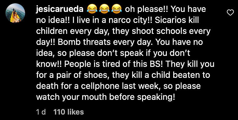 “Oh please!!” Jesicarueda declared. “You have no idea!! I live in a narco city!! Sicarios kill children every day, they shoot schools every day!! Bomb threats every day. You have no idea, so please don’t speak if you don’t know!! People is tired of this BS! They kill you for a pair of shoes, they kill a child beaten to death for a cellphone last week, so please watch your mouth before speaking!”