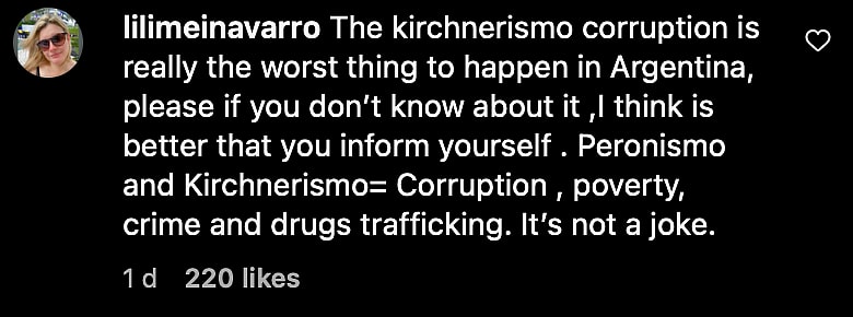 Seeking to educate the actor, Lilimeinavarro asserted, “The kirchnerismo corruption is really the worst thing to happen in Argentina, please if you don’t know about it ,I think is better that you inform yourself.”