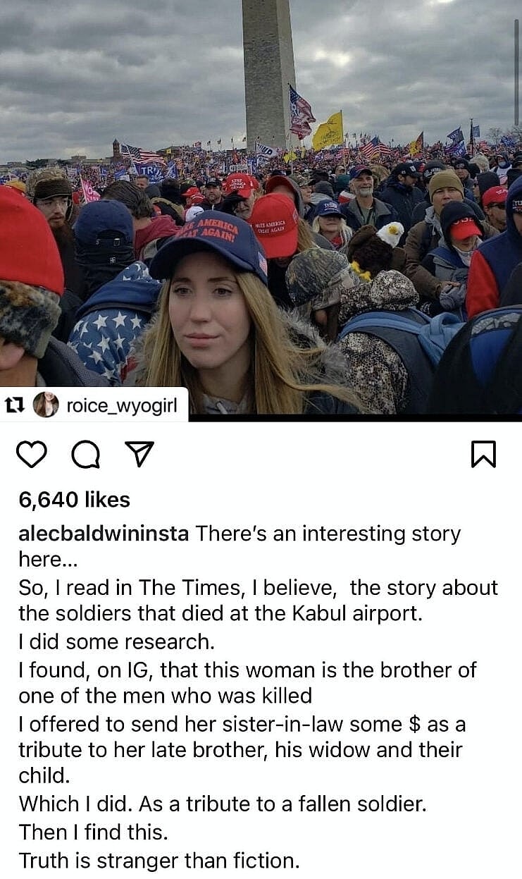 This didn’t sit well with the leftist actor, as shortly after Roice shared the pictures, Baldwin messaged her, “When I sent the $ for your late brother, out of real respect for his service to this country, I didn’t know you were a January 6th rioter.”