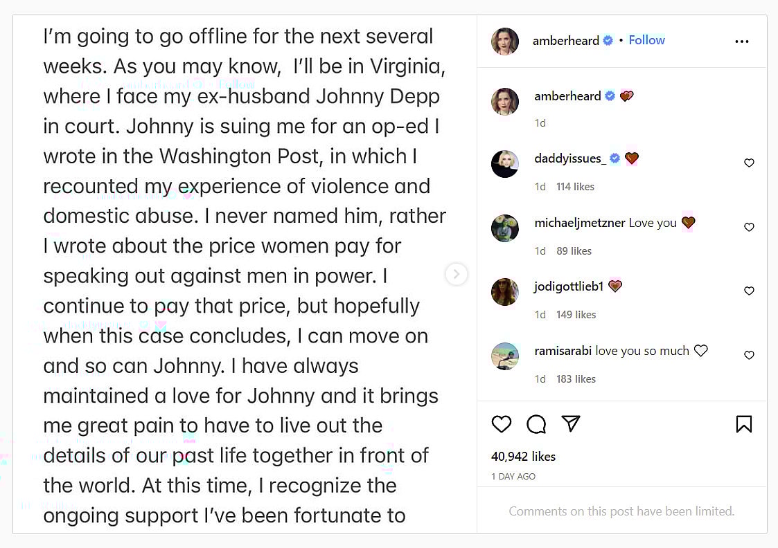 She wrote, “I’m going to go offline for the next several weeks. As you may know, I’ll be in Virginia, where I face my ex-husband Johnny Depp in court. Johnny is suing me for an op-ed I wrote in the Washington Post, in which I recounted my experience of violence and domestic abuse.”