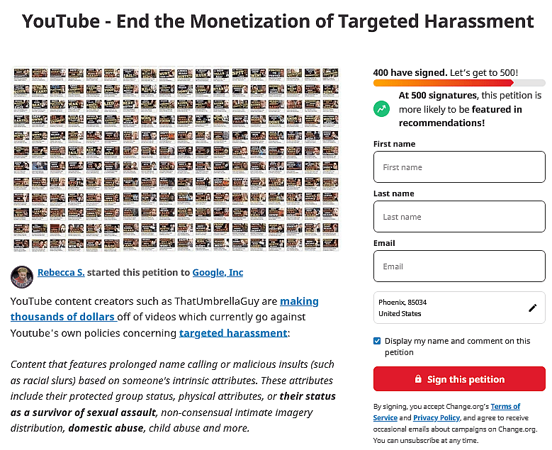 Circling back, the petition continued, “ThatUmbrellaGuy is only one example of the Youtubers who have turned targeted harassment into profits, and we fear that his success and the success of others like him will inspire others to create similarly malicious content to cash in on the harassment of others. “