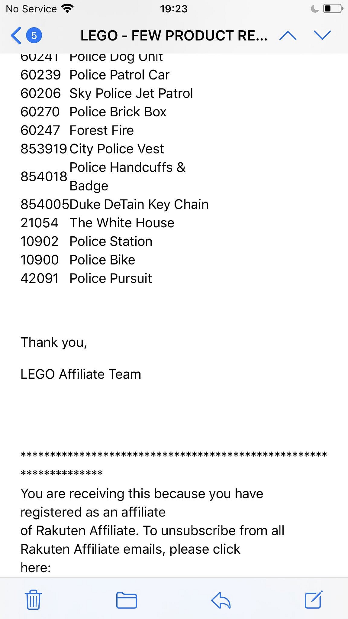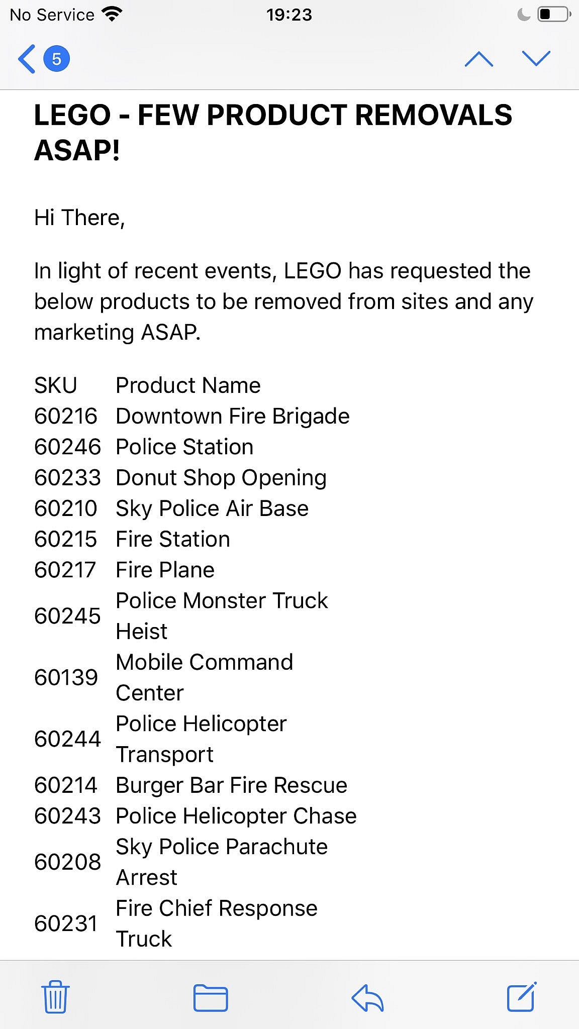 Just had an affiliate email asking for certain LEGO sets not to be advertised. They all seem to be related to emergency services – anyone have any idea what’s happening?