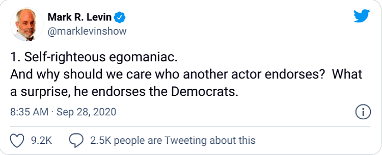 Levin called Johnson a “Self-righteous egomaniac” in a tweet adding “And why should we care who another actor endorses? What a surprise, he endorses the Democrats.”