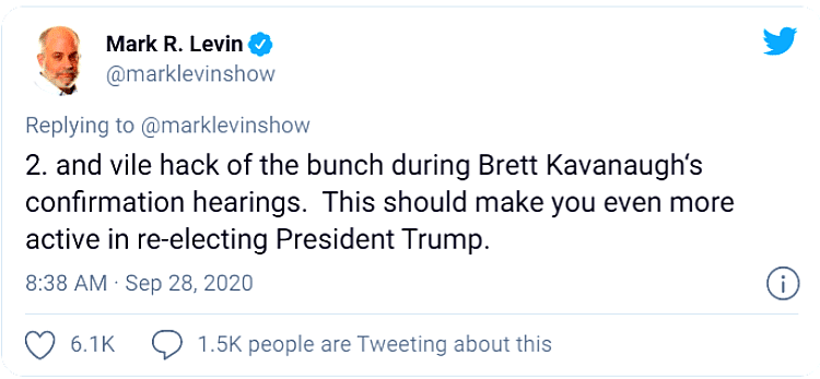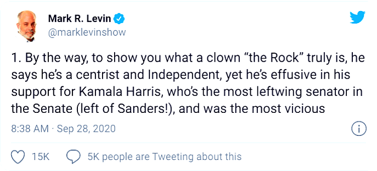 “By the way, to show you what a clown ‘the Rock’ truly is, he says he’s a centrist and Independent, yet he’s effusive in his support for Kamala Harris, who’s the most leftwing senator in the Senate (left of Sanders!), and was the most vicious and vile hack of the bunch during Brett Kavanaugh‘s confirmation hearings,” Levin tweeted.