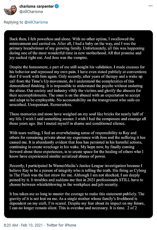 “For nearly two decades, I have held my tongue and even made excuses for certain events that traumatize me to this day,” wrote Carpenter in the first of two images posted to Twitter on February 10th, captioned “My Truth. #IStandWithRayFisher.” “Joss Whedon abused his power on numerous occasions while working together on the sets of Buffy the Vampire Slayer and Angel.”