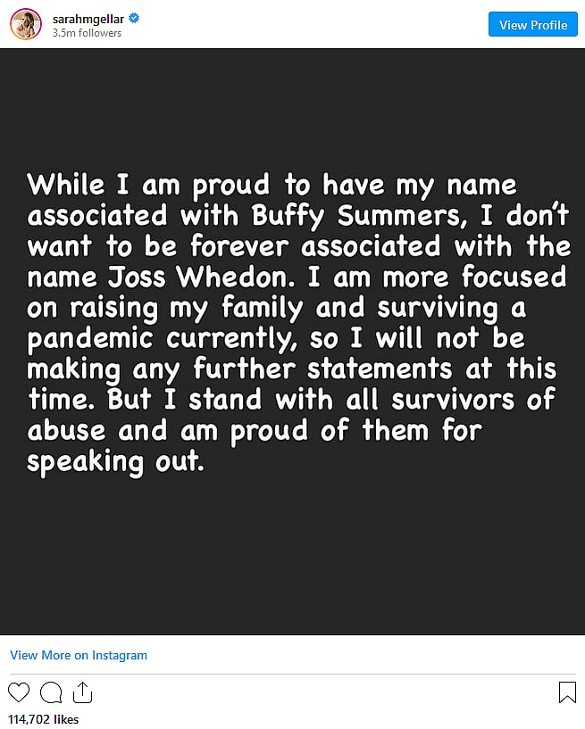 Sarah Michelle Gellar, who portrayed the eponymous Buffy Summers, wrote on Instagram that “While I am proud to have my name associated with Buffy Summers, I don’t want to be forever associated with the name Joss Whedon.”
