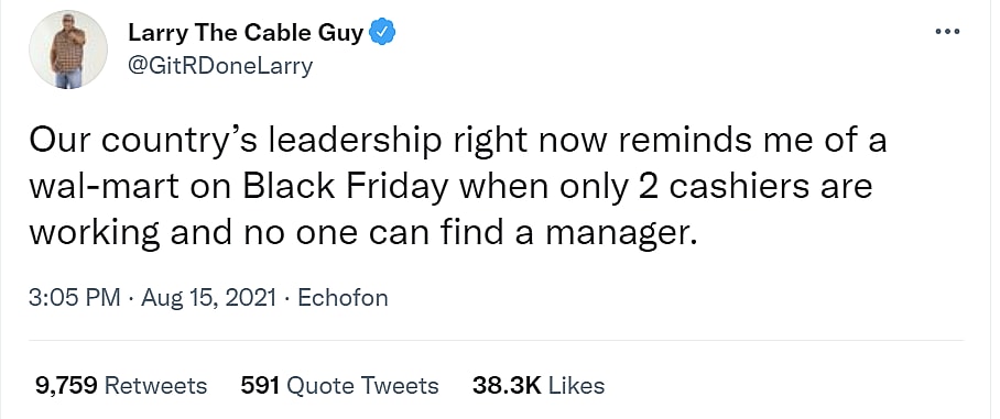 Following the Taliban taking over Afghanistan’s capital city of Kabul, Cars actor and stand-up comedian Larry The Cable Guy put American leadership on blast in a way that only he can do.
