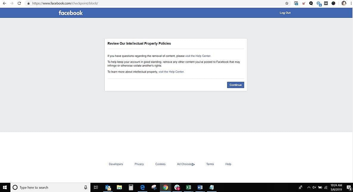 The next alert then directed us to review Facebook’s Intellectual Property Policies. It read, “If you have questions regarding the removal of content please visit the Help Center. To help keep your account in good standing, remove any other content you’ve posted to Facebook that may infringe or otherwise violate another’s rights. To learn more about intellectual property, visit the Help Center.”