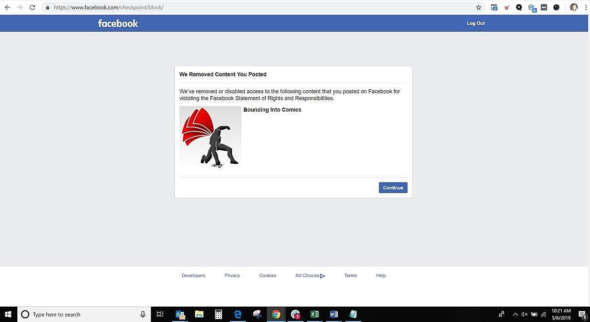The first alert indicated Bounding Into Comics was being removed because it violated “the Facebook Statement of Rights and Responsibilities.”