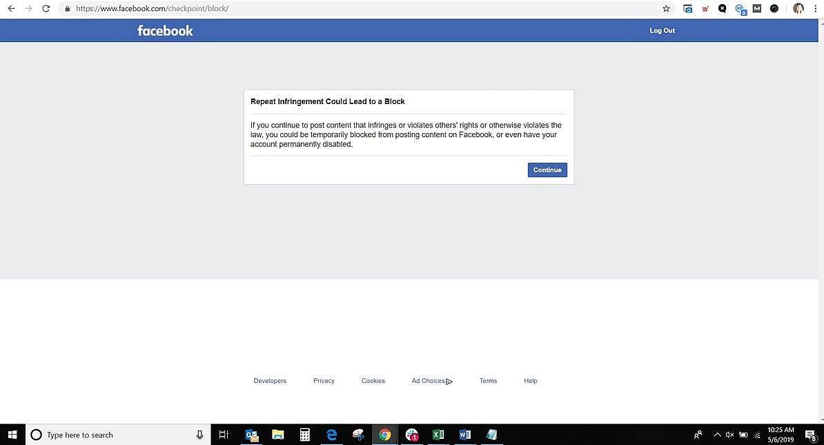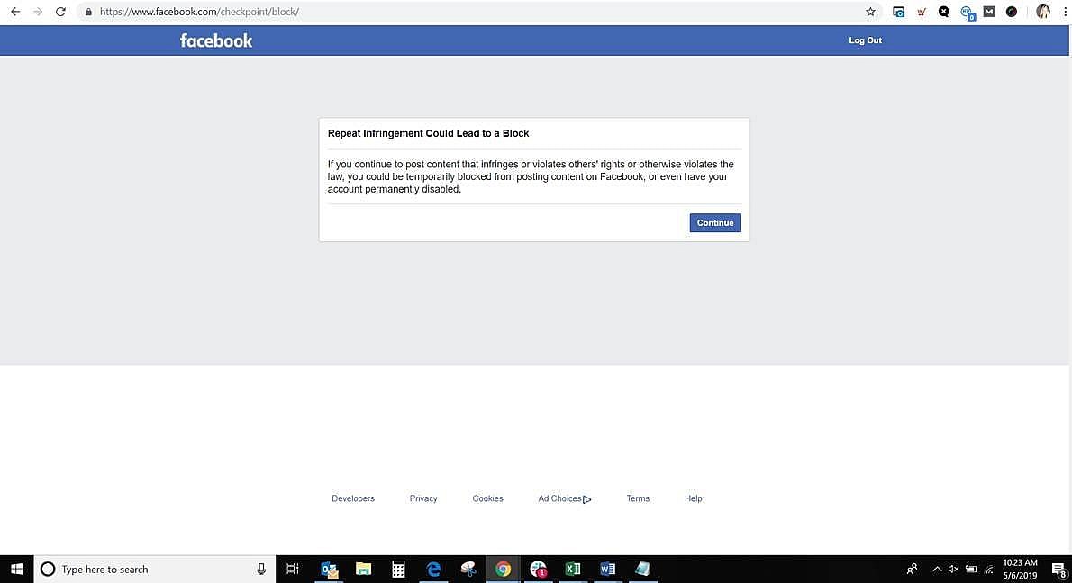 The final message read, “If you continue to post content that infringes or violates others’ rights or otherwise violates the law, you could be temporarily blocked from posting content on Facebook, or even have your account permanently disabled.”