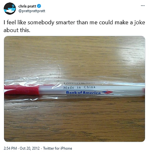 In this particular tweet, Pratt posted a picture of a Bank of America branded pen with the words ‘Made in China’ written on its side and wrote, “I feel like somebody smarter than me could make a joke about this.”
