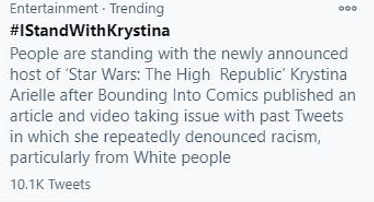 It’s in stark contrast to the update they provided after Bounding Into Comics reported on a number of tweets from Star Wars: The High Republic Show host Krystina Arielle, where she accused white people of being racists.