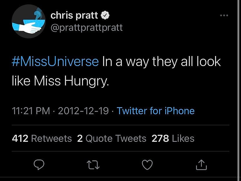 In another, which many users failed to notice features the same posting date, time, and number of engagements as the one above, Pratt appears to make an eating disorder-based joke, stating “#MissUniverse In a way they all look like Miss Hungry.”