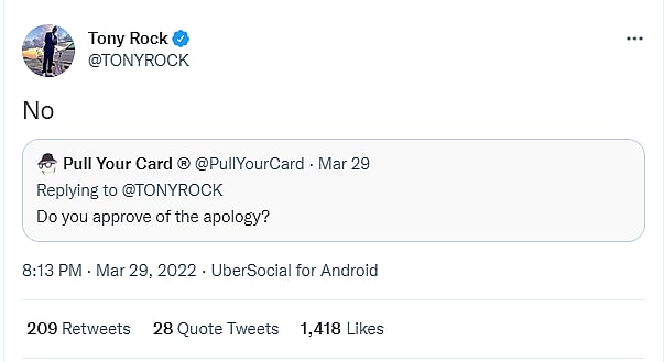 Kenny Rock is not the only sibling of Chris Rock who is not accepting Will Smith’s apology. Tony Rock was asked on Twitter if he approved of the apology. He responded simply writing, “No.”