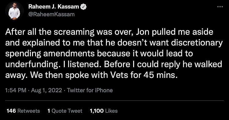 “After all the screaming was over, Jon pulled me aside and explained to me that he doesn’t want discretionary spending amendments because it would lead to underfunding,” he would later admit. Kassam further recalled, “I listened. Before I could reply he walked away. We then spoke with Vets for 45 mins.”