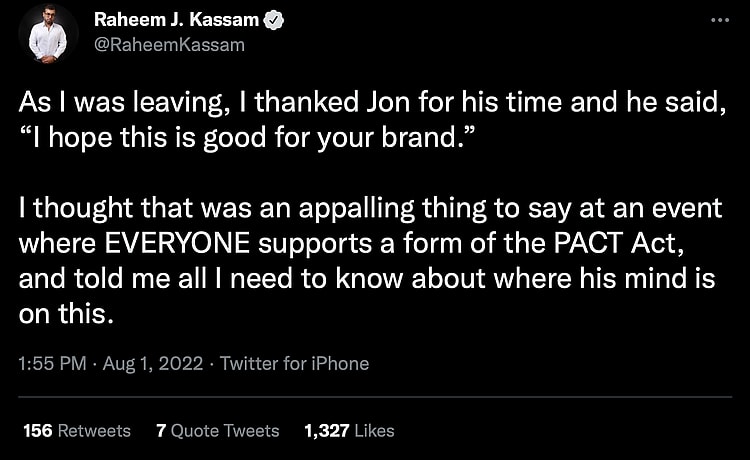 In a follow-up tweet, the editor for The National Pulse pointed out that Stewart unceremoniously told him “I hope this is good for your brand,” as he was leaving. “I thought that was an appalling thing to say at an event where EVERYONE supports a form of the PACT Act, and told me all I need to know about where his mind is on this,” he added.