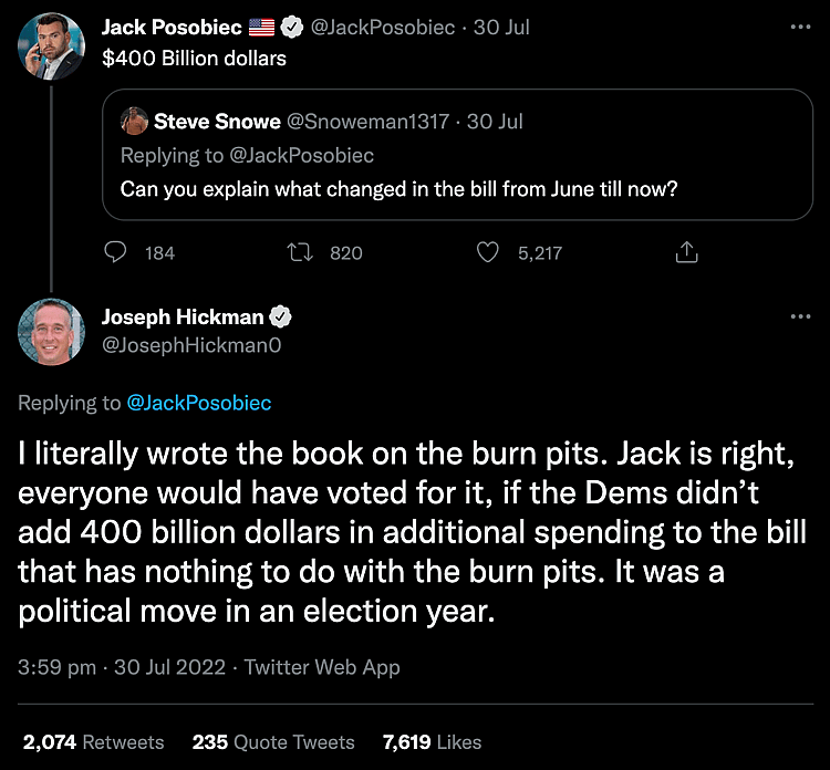 Echoing Posobiec’s response, Hickman declared, “I literally wrote the book on the burn pits. Jack is right, everyone would have voted for it, if the Dems didn’t add $400 billion dollars in additional spending to the bill that has nothing to do with the burn pits. It was a political move in an election year,” he concluded.