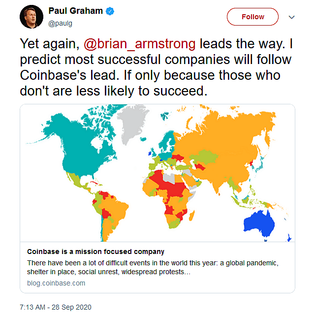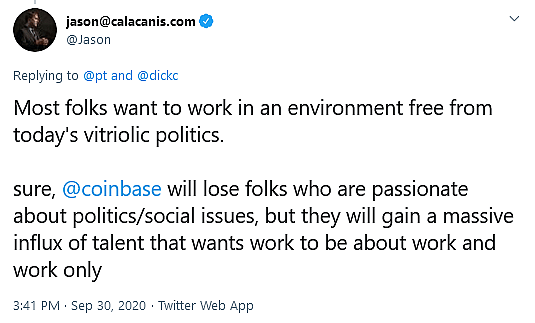 Armstrong further explained “that while I think these [social and political activism] efforts are well intentioned, they have the potential to destroy a lot of value at most companies, both by being a distraction, and by creating internal division.”