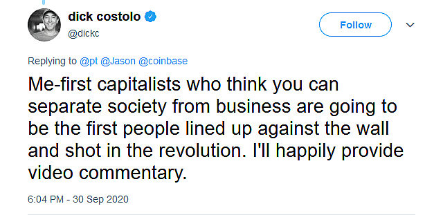 In response to this pushback, Costolo would shockingly declare in a now-deleted tweet that “Me-first capitalists who think you can separate society from business are going to be the first people lined up against the wall and shot in the revolution.”